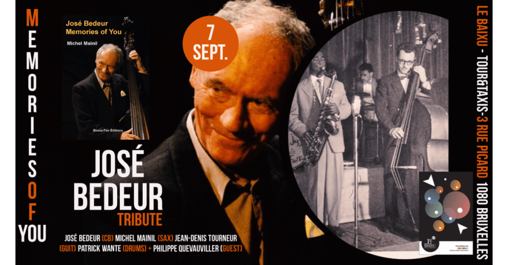 The evening will begin with a conversation with Jose Bedeur and Michel Mainil, during which you will be able to discover some of the many anecdotes that have marked José Bedeur’s career and that Michel Mainil has recounted so well in his book “Memories of You” (available during the evening). The moving musical moment that will follow this introduction will feature José Bedeur (double bass) in a band that will also include Michel Mainil (Sax) Jean- Denis Tourneur (Guitar) Patrick Wante (Drums) and special guest Philippe Quevauviller (vocals), who is also the editor of Michel Mainil’s book “Memories of You”. Denis Tourneur (Guitar) Patrick Wante (Drums) and, at the end of the evening, special guest Philippe Quevauviller (vocals) who is also the editor of Michel Mainil’s book “Memories of you”.
