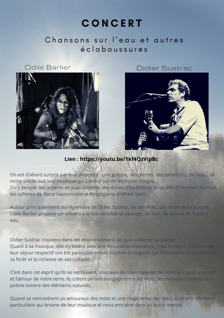 Com base no repertório de Didier Sustrac, suas palavras, seus vocais e seu violão, Odile Barlier cria um mundo sonoro muito especial, composto de percussão, sopros de madeira, vozes, flautas e água. Nossos ouvidos acompanham suas músicas, que se estende por muitas paisagens, começando pelas da Amazônia. Ouvimos os acordes de João Gilberto, as ressonâncias de Iva Bittova, a respiração de Hermeto Pascoal, os ritmos de Nana Vasconcellos…