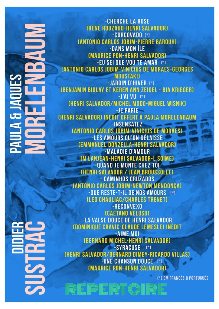 Choisir aujourd’hui Paula et Didier pour les réunir enfin sur scène, revient à épouser le temps d’une soirée les saveurs portées par l’une des voix féminines et des personnalités les plus représentatives de la musique du brésil, et les parfums d’un musicien poète un peu baroudeur, qui feront swinguer avec douceur (*) les mots portés jadis par les voix d’un grand chanteur vêtu de blanc, du nom de Salvador, et du Maestro Antonio Carlos Jobim.